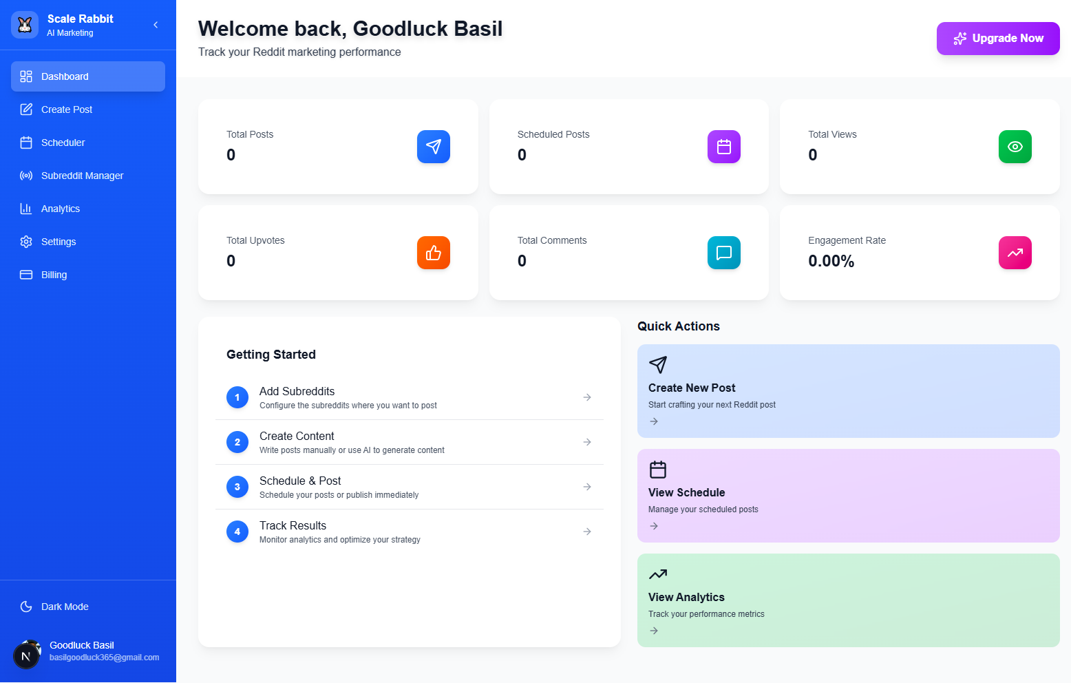 Get traction and market validation fast, scale, and reach more customers with effortless Reddit Automation Marketing. Create, schedule, and post across multiple subreddits instantly. Let AI write your posts and Scale Rabbit handle the rest.